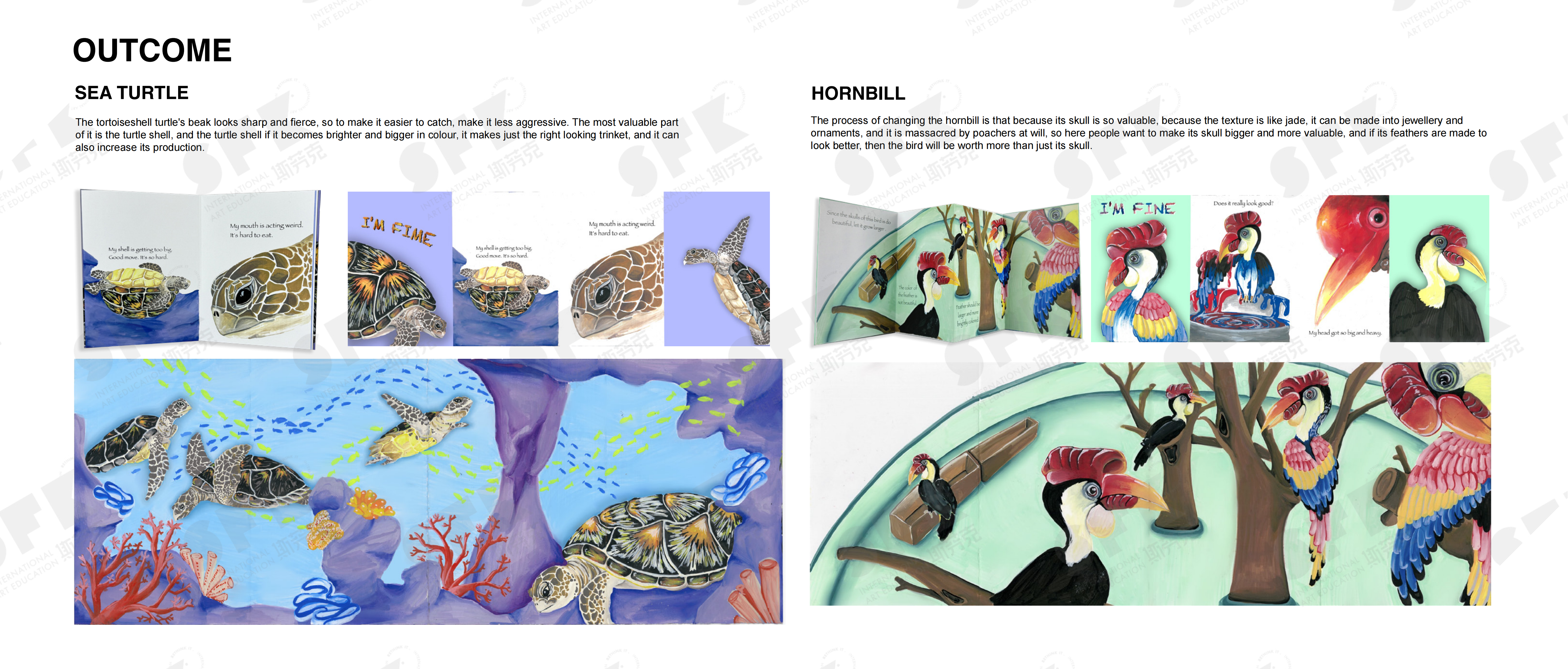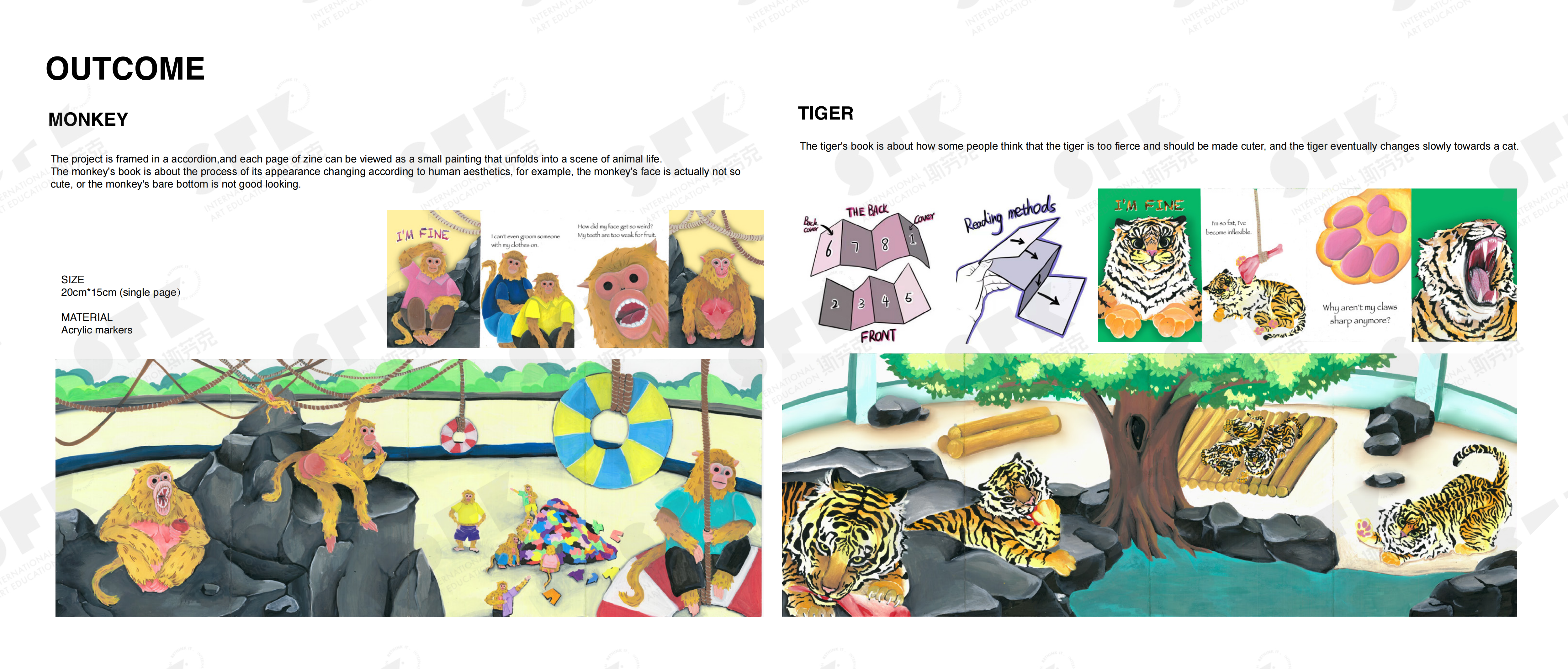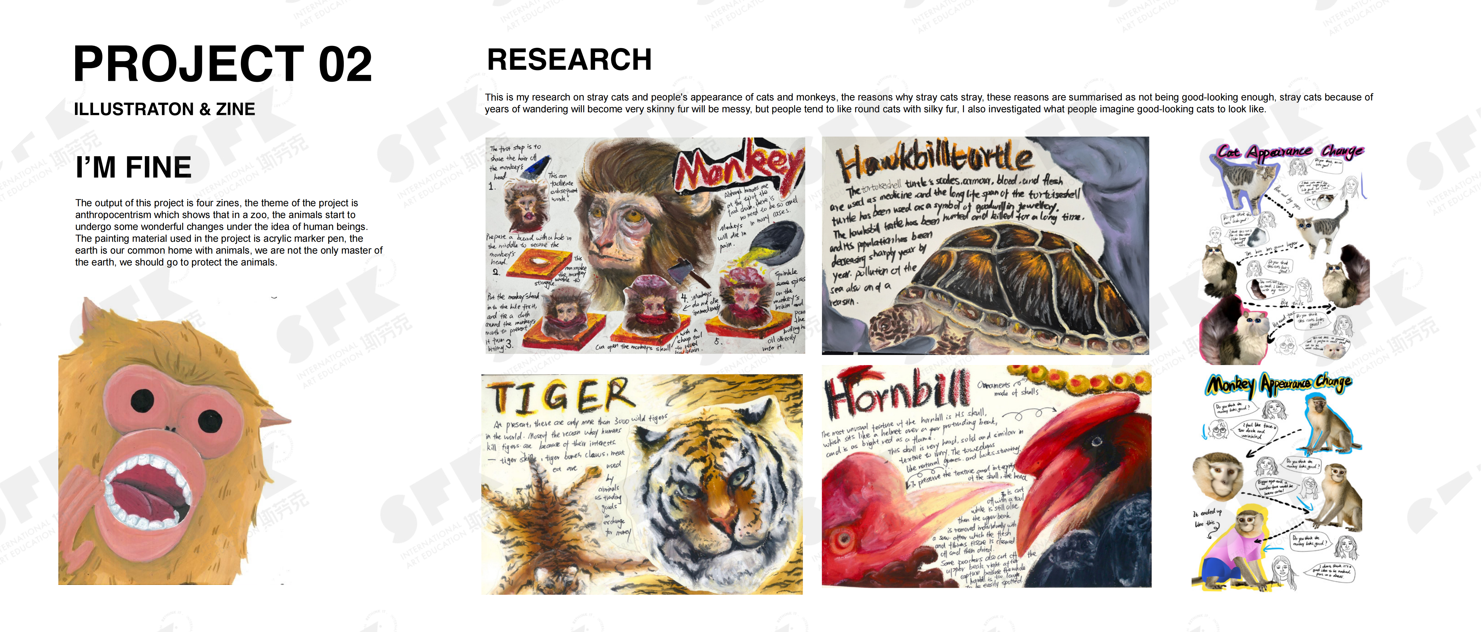 The output of this project is four zines, the theme of the project is anthropocentism which shows that in a zoo, the animals start to undergo some wonderful changes under the idea of human beings. The painting mateial used in the project is acrylic marker pen, the earth is our common home with animals, we are not only a master of the earth, we should go to protect animals.