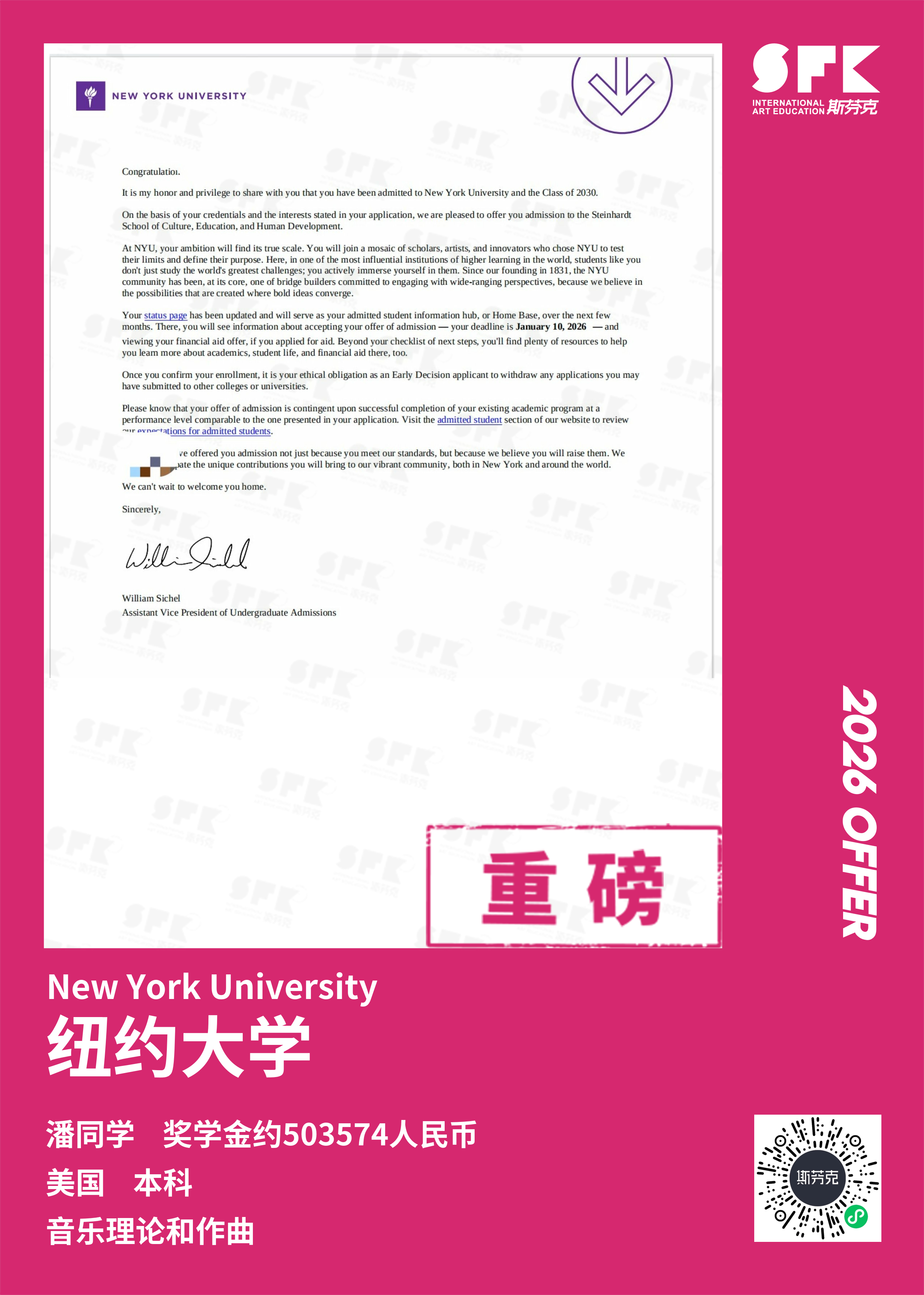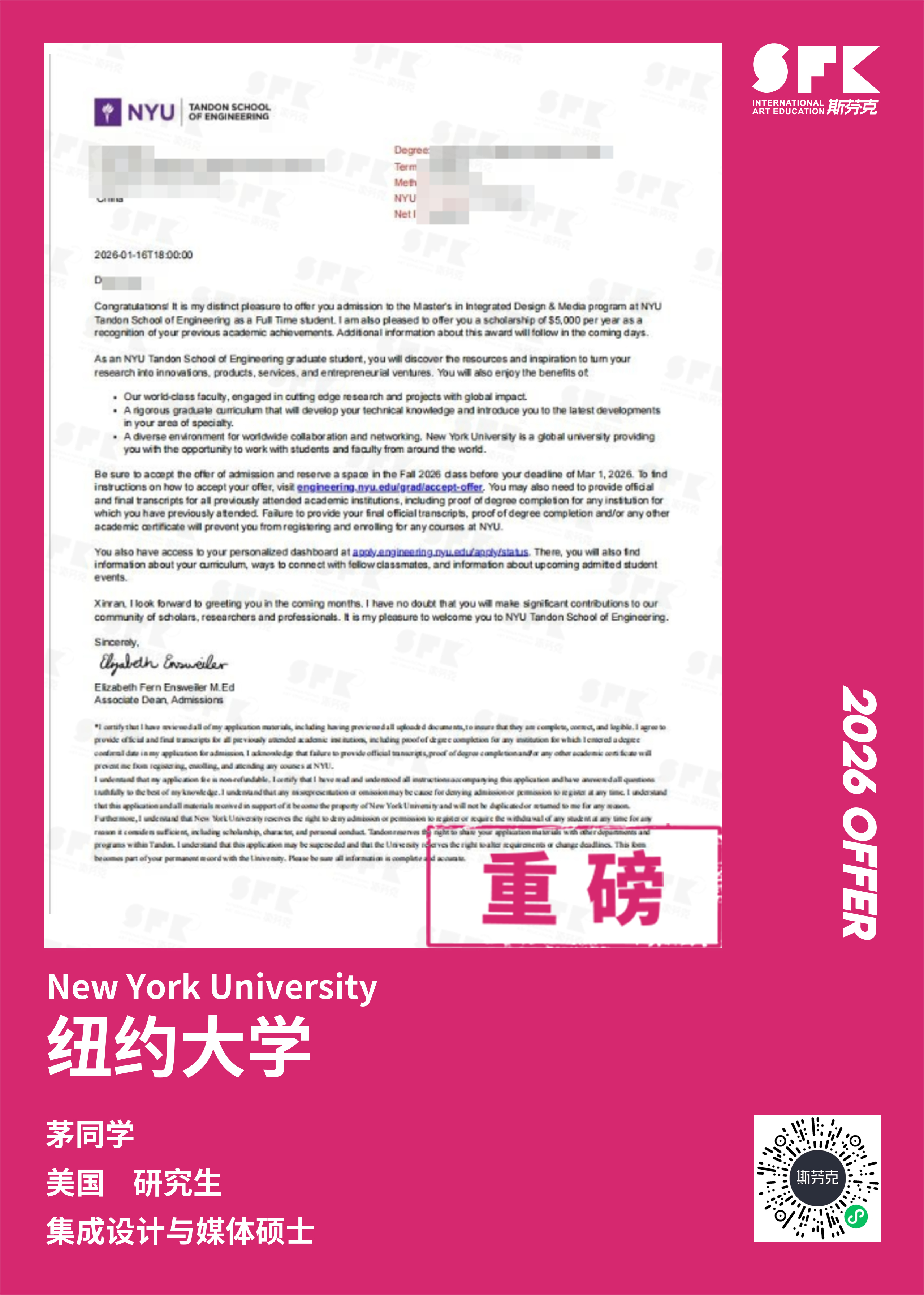 2023-01-05本期学员:王同学,SFK23季学员,游戏动画科系录取专业:游戏设计-本科;目前已拿offer:纽约大学游戏设计专业本期的SFK...